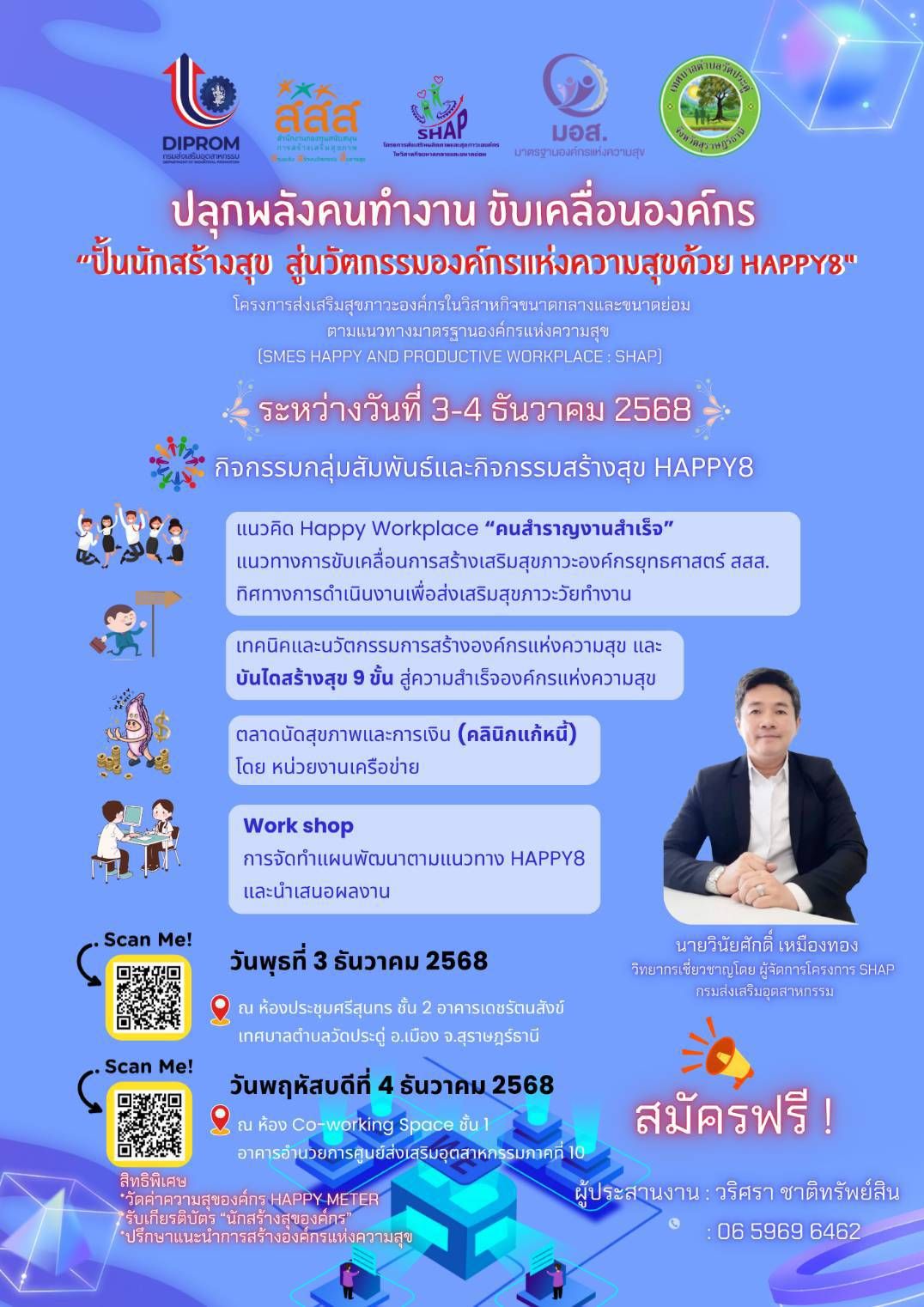 รุ่นที่ 2 ในวันที่ 4 ธันวาคม 2568 ณ ศูนย์ Happy Workplace Center ภาคใต้ ชั้น 1 อาคารอำนวยการ ศูนย์ส่งเสริมอุตสาหกรรมภาคที่ 10 จังหวัดสุราษฎร์ธานี