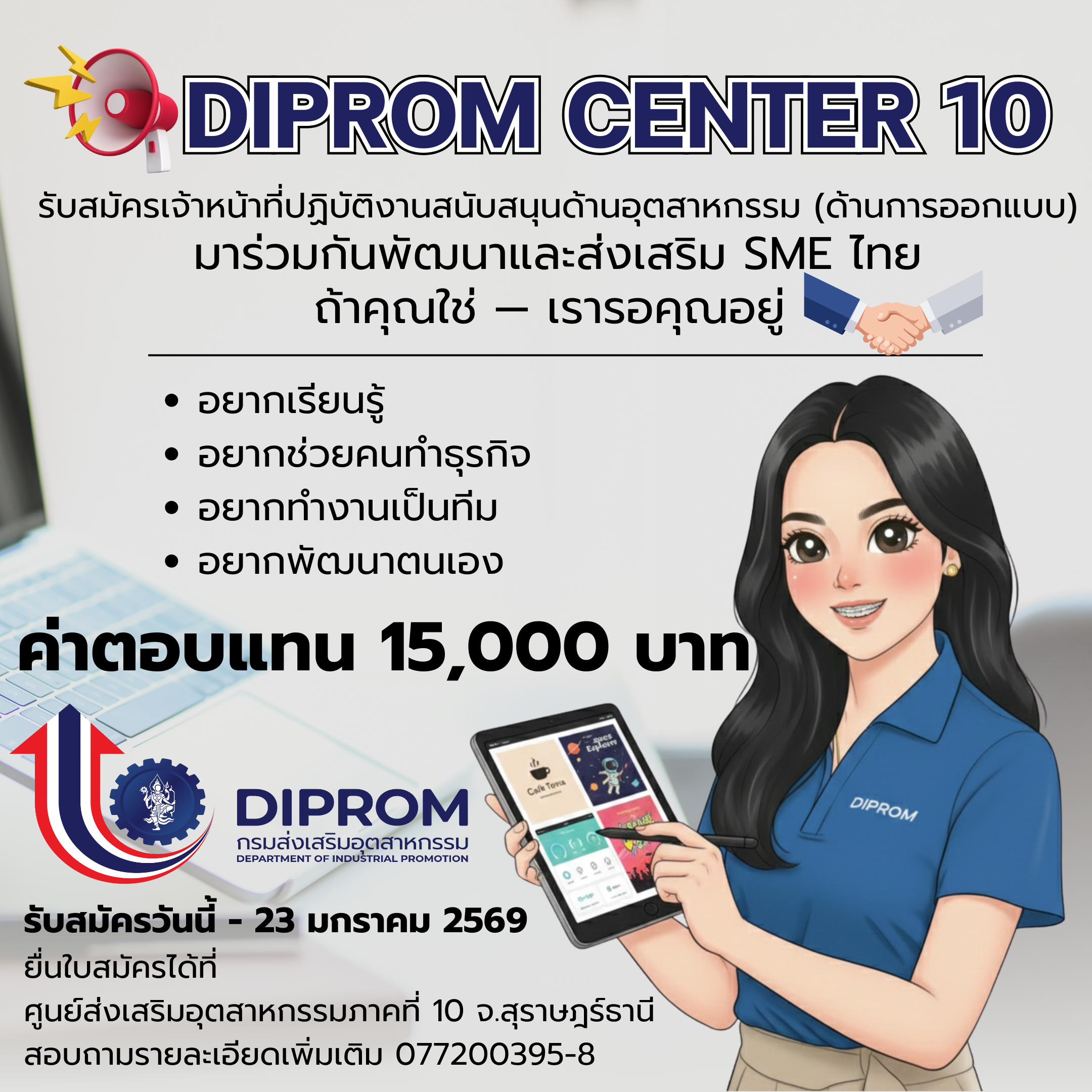 ตำแหน่ง เจ้าหน้าที่ปฏิบัติงานสนับสนุนด้านอุตสาหกรรม (ด้านการออกแบบผลิตภัณฑ์) เพื่อสนับสนุนการปฏิบัติงานตามภารกิจของศูนย์ส่งเสริมอุตสาหกรรมภาคที่ ๑๐
